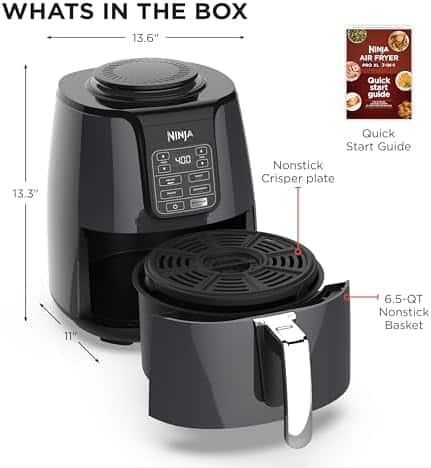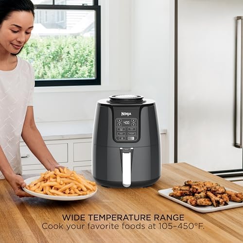 Time is precious, even more so when you’ve got hungry mouths to feed. Why wait for your oven to preheat and then slowly cook that highly anticipated meal when there’s a quicker way to put food on the table for your whole family? Meet the Ninja Air Fryer, a fast and easy way to cook your favorite foods. It ensures even circulation of hot air around your food for quick, crispy, and golden finishes, every time. The secret is the smart processor that delivers a wide temperature range while powering the fan that automatically adjusts speeds based on your cooking function, allowing you to cook and crisp your favorite foods, like 2 lbs. of French fries, using little to no oil in a family-sized 4-quart ceramic-coated basket. The wide temperature range gives you the ability to roast, bake, air fry, reheat, or dehydrate foods, making it your new go-to appliance for any meal or snack. With the Ninja Air Fryer on your countertop, you can pull crispy meals out of thin air.